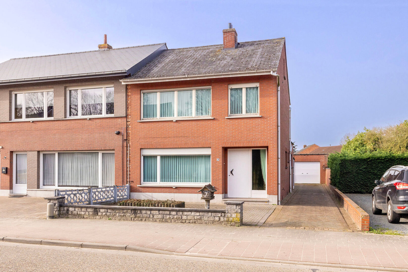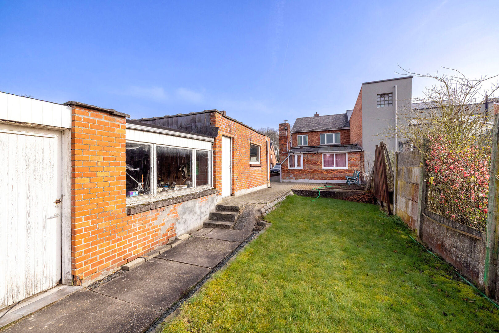 Halfopen bebouwing met 3 slaapkamers, garage, werkatelier en tuin.