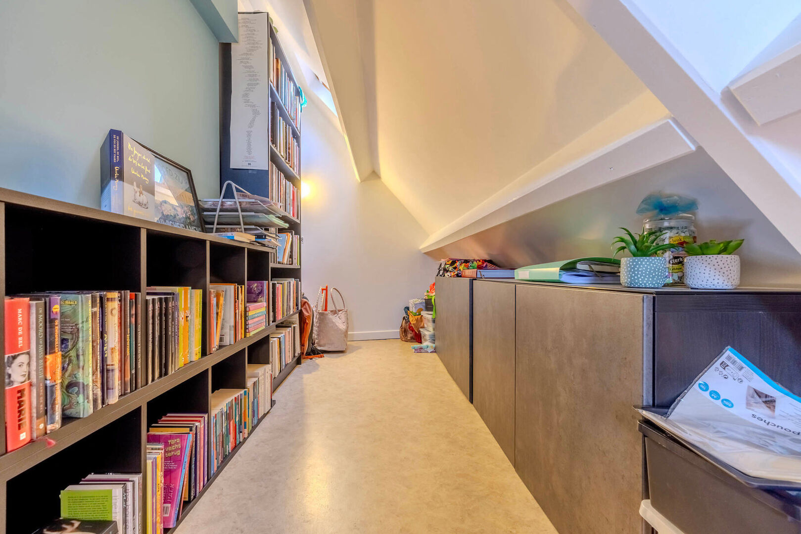 Indeling: inkomhal; apart toilet; toegang tot een privatief en achterliggend terras; gezellige leefruimte met hoge plafonds; ruimte bovenaan is momenteel ingericht als leeshoek + extra bergruimte; volledig vernieuwde en geïnstalleerde keuken (2024); masterbedroom; ensuite badkamer met lavabo, douche in bad en aansluiting voor WM en DK.